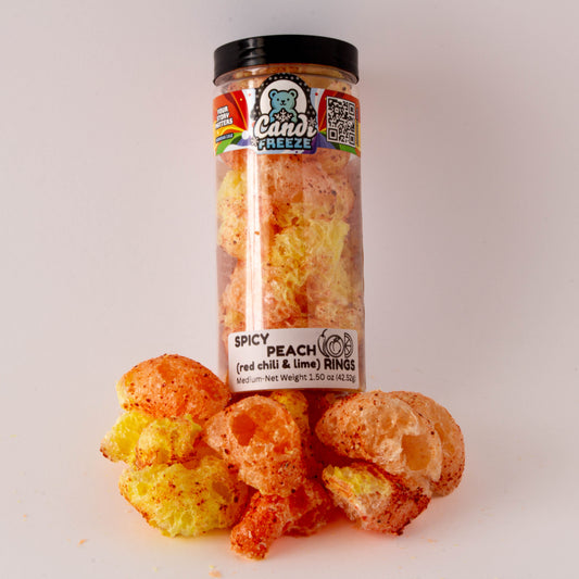 Spicy Peach Ring Crunch by CandiFreeze – Freeze-Dried, Crunchy, Sweet & Tangy Chili Lime Candy – 1.5oz Resealable Jar